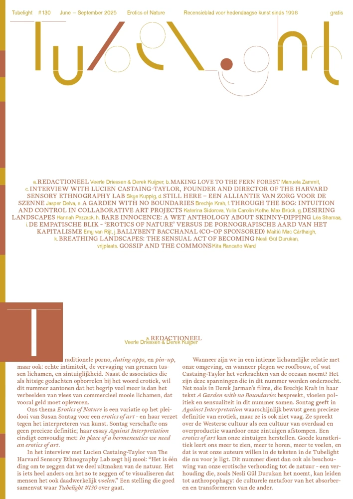 The essay Desiring Landscapes, published in issue 130 of Tubelight (themed The Erotics of Nature), explores feminist and queer depictions of landscapes as sites of desire, dissolution, and ecstatic entanglement. Through Derek Jarman’s film In the Shadow of the Sun (1974–81), Jenny Hval’s novel Girls Against God (2020), and eco-poetic works by Himali Singh Soin, the essay examines how landscapes resist the colonial gaze by becoming volatile, sensual agents rather than passive backdrops. Drawing on Jack Halberstam’s concept of wildness as a queer refusal of mastery, the analysis considers how the feral and untamed open space for alternative erotic relations beyond ownership and control. → Read