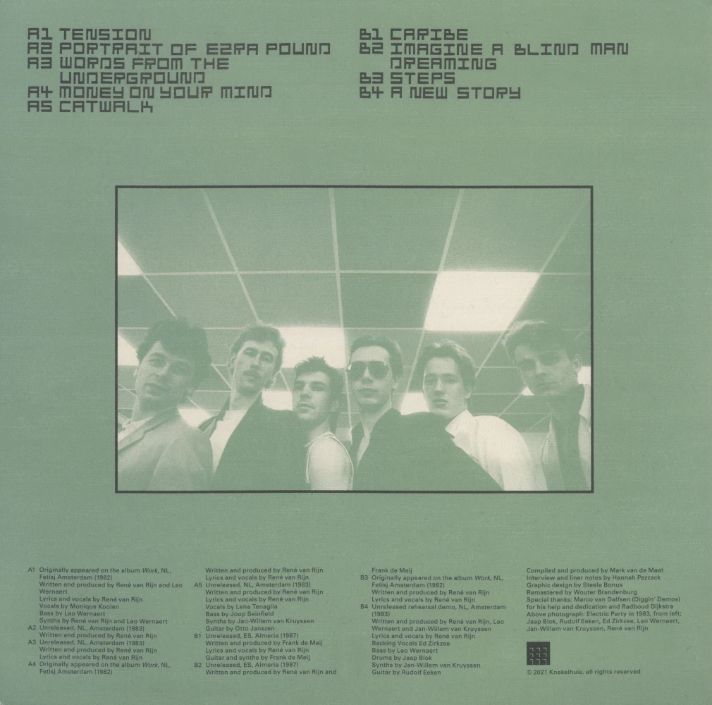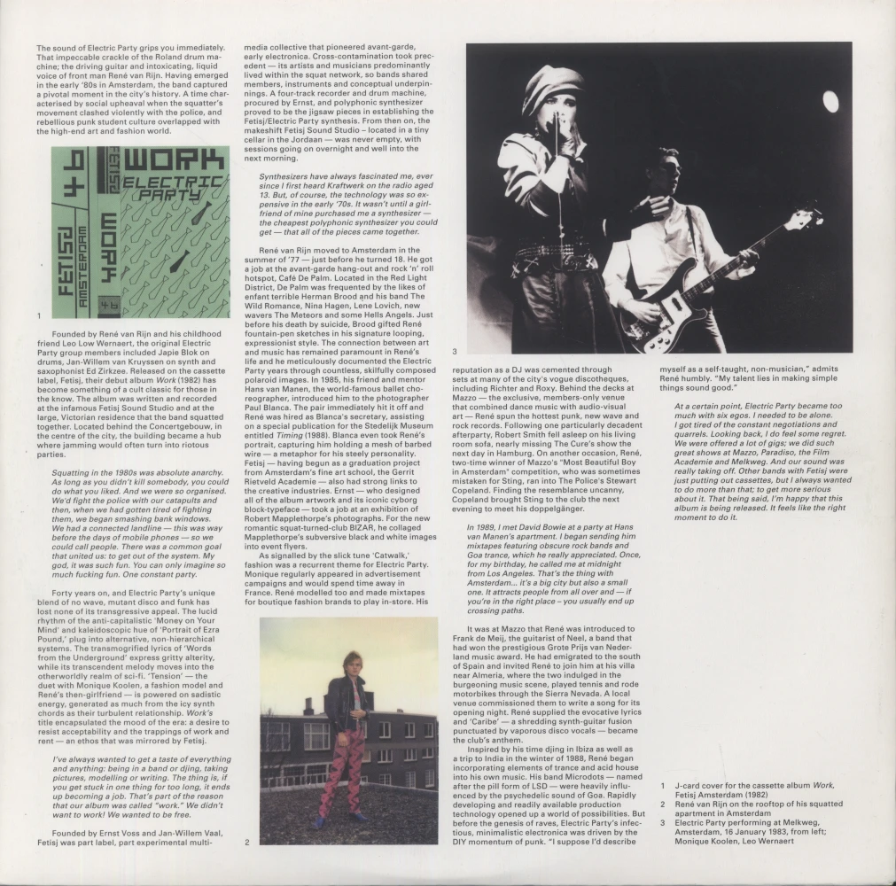 A Dutch record label and podcast series. Liner notes for Play, a reissue from 1980s synth band Electric Party, were based on an interview with frontman René van Rijn, recalling a vivid chapter in Amsterdam’s history – when squatter uprisings clashed with police, and the city’s clubs drew figures such as David Bowie, The Rolling Stones, and The Cure. → Read