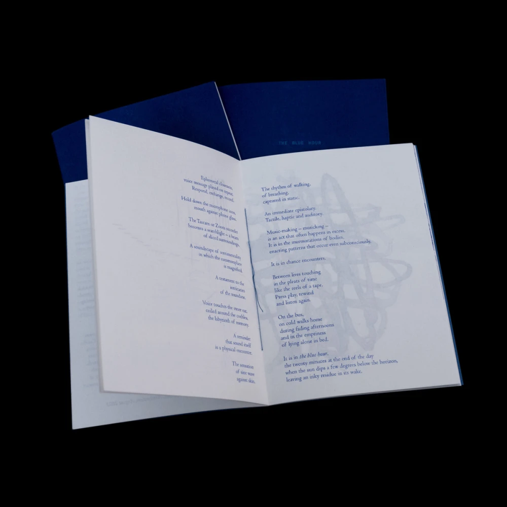 Based in Glasgow, UK, Somewhere Between queers notions of experimental music and print. Recent projects include reveries by doris dana and The Blue Hour – V/A: Poem & Liner Notes, a print publication and split-side release encircling themes of liminality, sonic intimacy, and collective creative processes. This latter project began with an original poem titled The Blue Hour (authored by Hannah Pezzack), referencing the fleeting twenty minutes between dusk and nightfall: 'the twenty minutes at the end of the day when the sun dips a few degrees below the horizon, leaving an inky residue in its wake.' → Read
